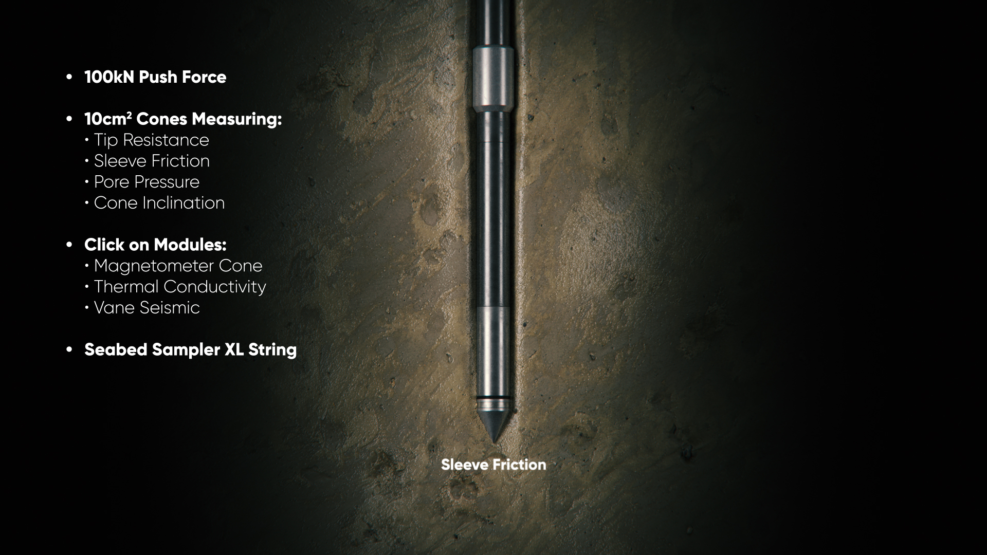The R100 features a modular design with an adjustable weight range from 8.0 t to 19 t, making it suitable for deployment from smaller vessels or adaptable to varying seabed conditions. An optional mud skirt can be added to minimise sinkage and ensure the cone remains unloaded prior to testing, supporting accurate and consistent CPT data acquisition.